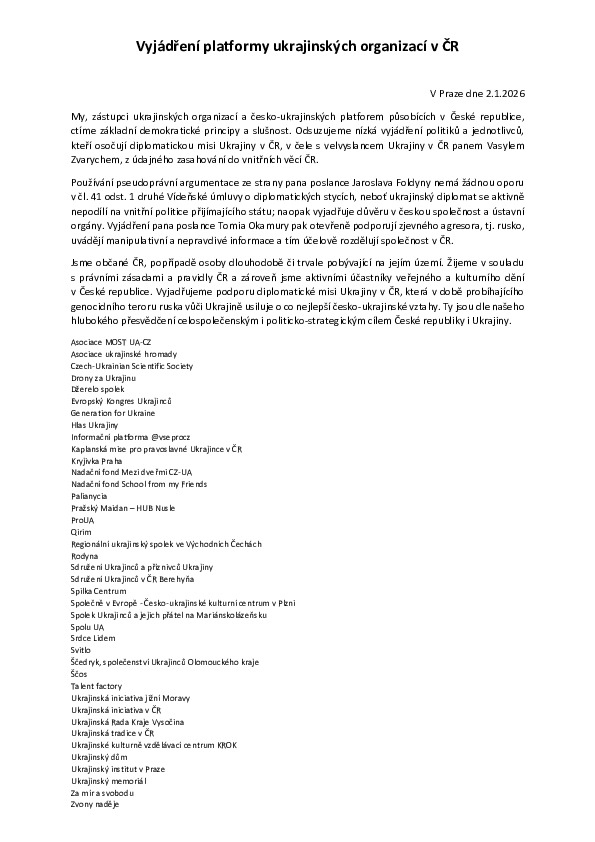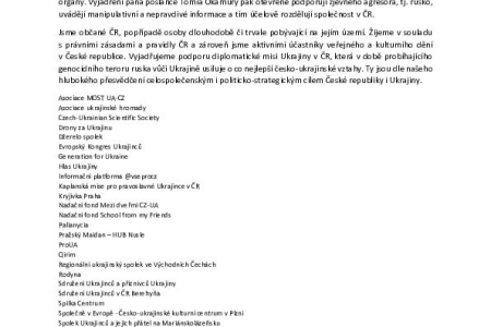 Посольство України у відповідь наголосило на наявності проросійських наративів у заявах окремих політиків, що особливо небезпечно в час російської агресії проти України. Заяву на підтримку Посольства України підписали понад 30 українських організацій у Чеській Республіці.